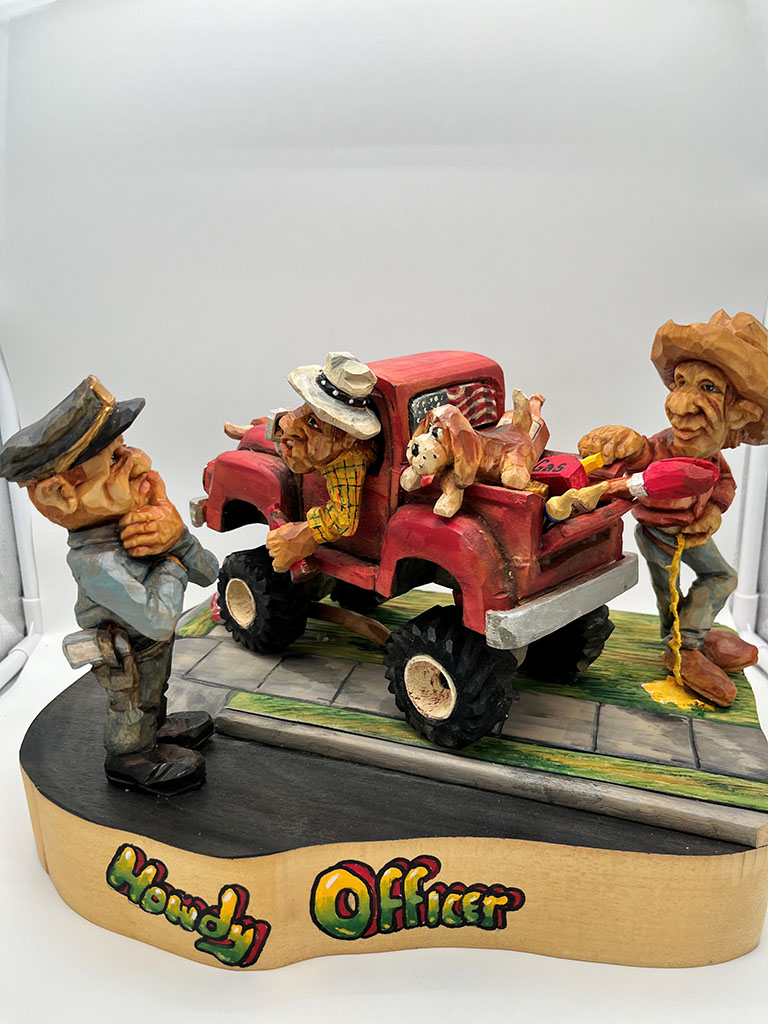Wayne lives in Sparta, IL. He began carving over 25 years ago. While owning a business and raising two children he carved when he had time. In January 2014 Wayne retired. This extra time allowed him to focus on taking his caricature carvings to the next level.